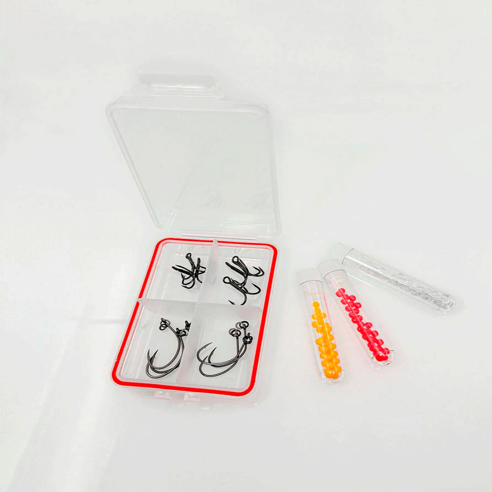 Du får ikke bare kroge, men også et stort udvalg af perler. De bløde gummierperler beskytter din knude mod slid fra gennemløberen og fungerer som et attraktivt, UV-aktivt hugpunkt i rød eller orange. De hårde glasperler (clear spacer beads) bruges til at skabe afstand og sikre, at krogen hænger frit bag agnen.
